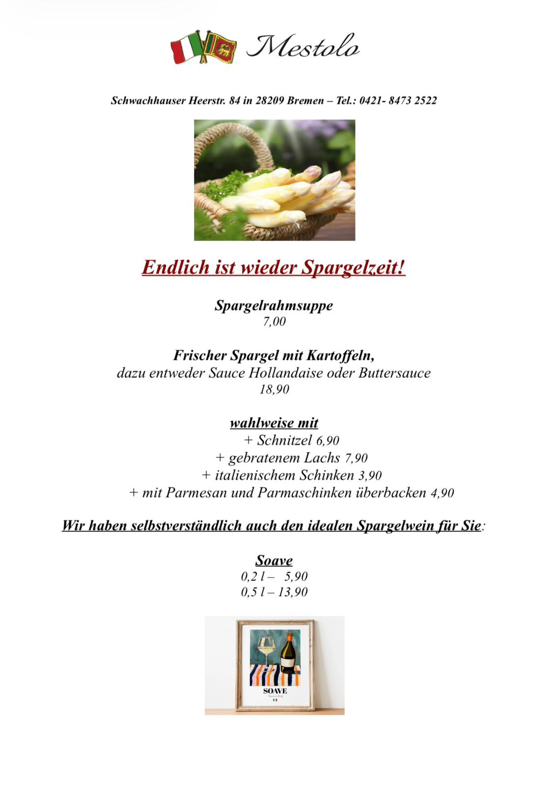 Die Spargelsaison beginnt! Schaut gerne auf unsere Spargelkarte weiter unten. Die Termine für ein Spargelbuffet ab 12 Personen sind auch offen, rufen Sie uns dazu gerne an für ein persönliches Angebot!