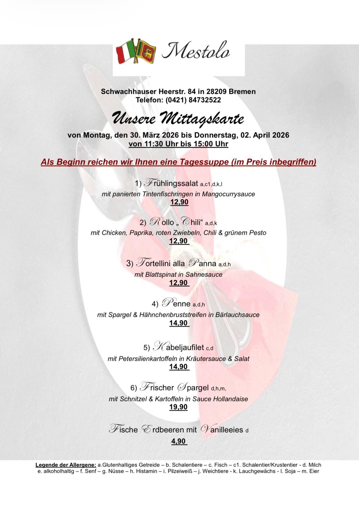 Die Spargelsaison beginnt! Schaut gerne auf unsere Spargelkarte weiter unten. Die Termine für ein Spargelbuffet ab 12 Personen sind auch offen, rufen Sie uns dazu gerne an für ein persönliches Angebot!
